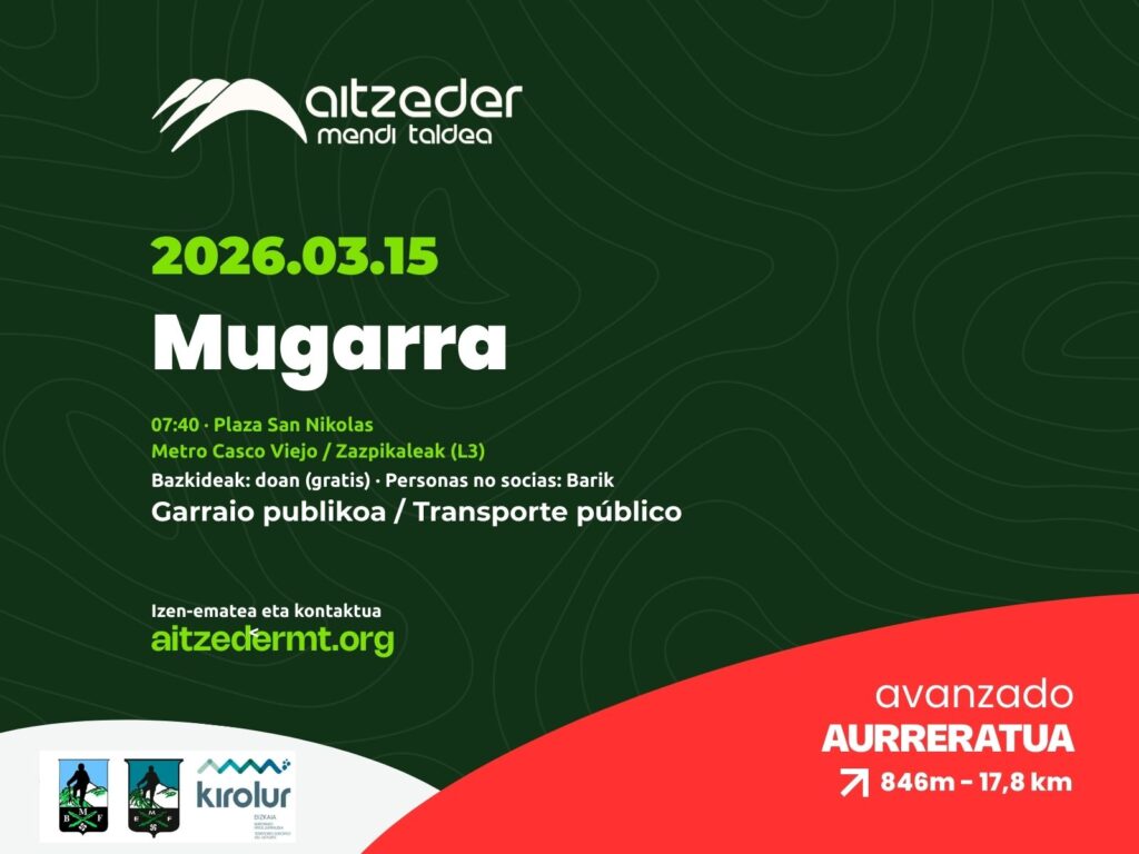 El domingo 15 de marzo realizaremos una salida al Mugarra, una ruta que combina un desafío estimulante con los paisajes realmente espectaculares del Duranguesado. Cada tramo de esa ruta ofrece algo diferente: zonas boscosas, vistas abiertas y, por supuesto, la recompensa de la cima, desde donde se disfruta de un panorama inolvidable del Duranguesado. Quedaremos a las 7:40 en la estación de Zazpikaleak/Casco Viejo, frente a la salida en la plaza San Nicolás.
